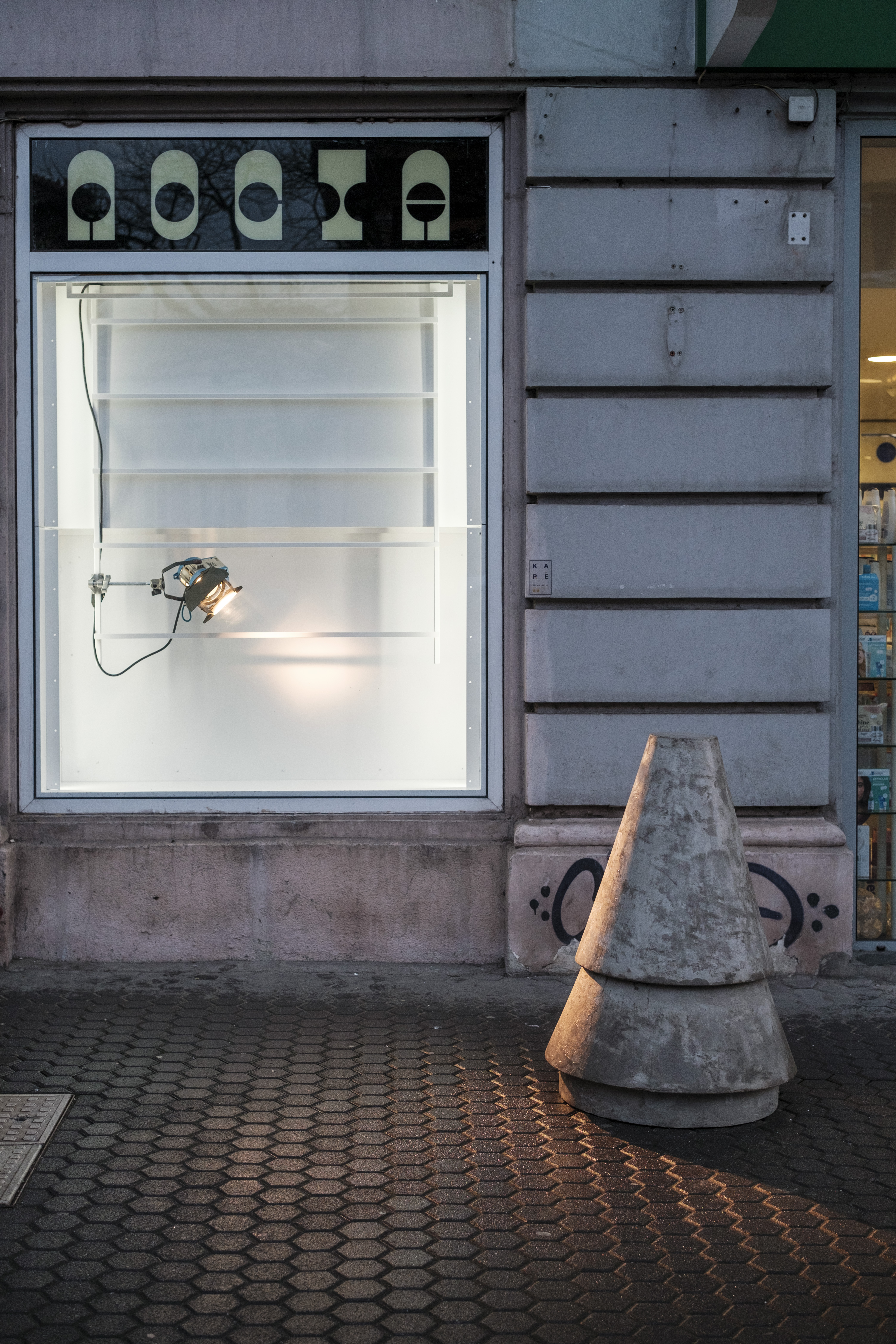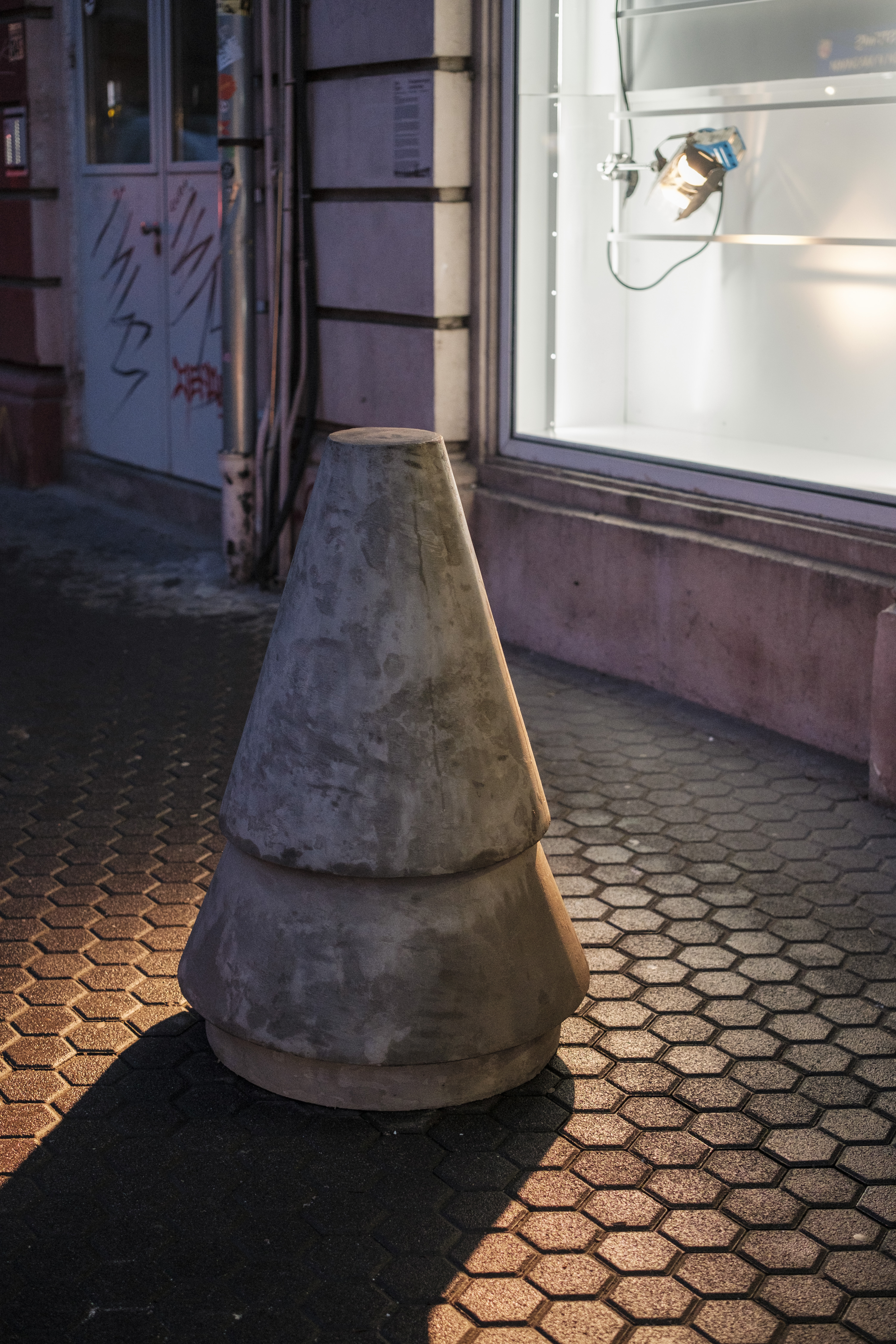 For the space of the POSTA gallery, the artist adapts already existing devices for public restrictions - the so-called empêche-pipi - structures at the corners of buildings to prevent urination. The chosen object has a relatively specific character as it combines prohibition and punishment. In a sense, it takes over the functions of a public authority, such as a policeman, who, instead of fining those caught urinating on corners or telling them to "Stop, don't!", otherwise punishes and deters them. And so the inanimate object takes on a particularly intense power charge (we would situate it higher in the hierarchy of power inanimate objects than, say, a road sign).