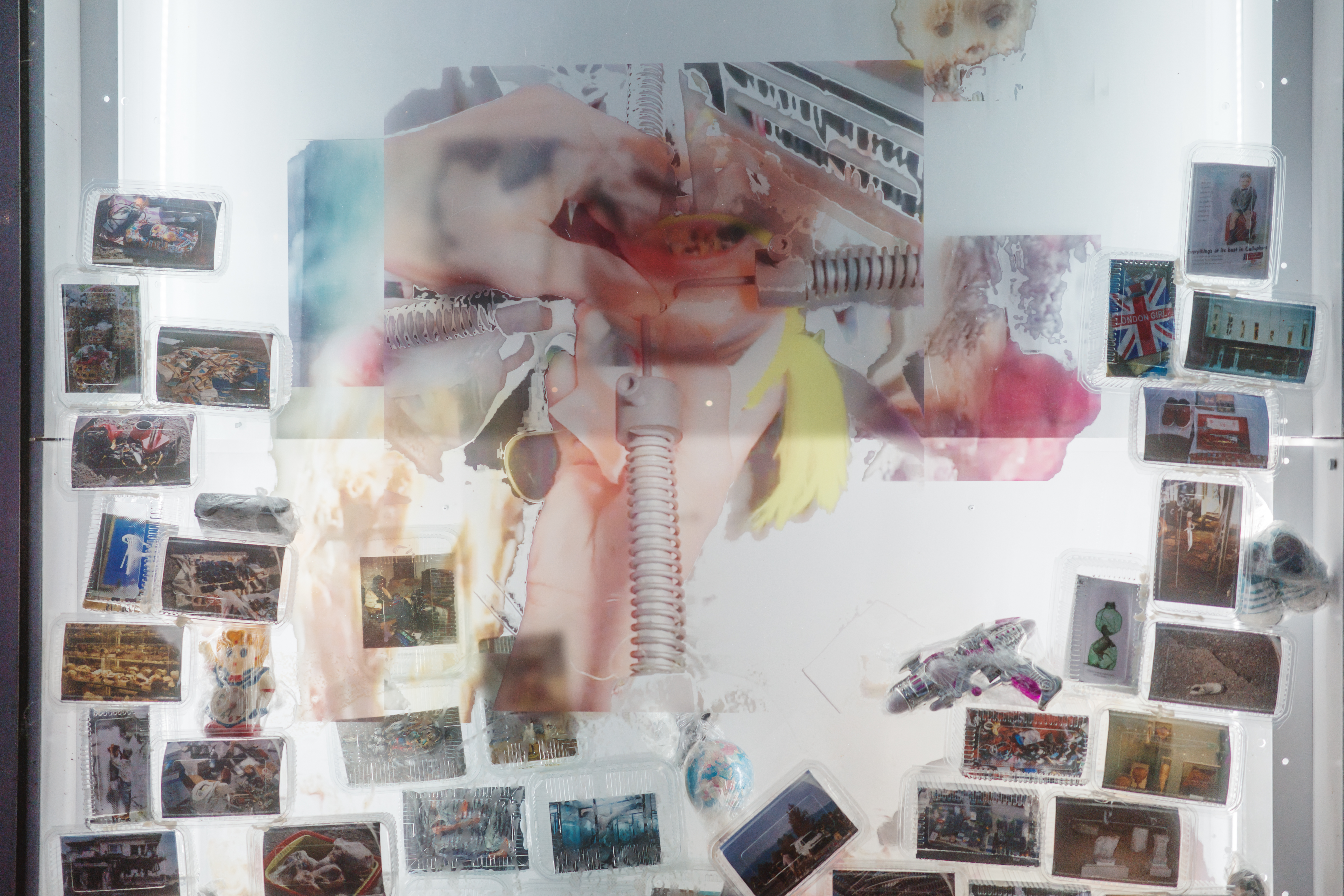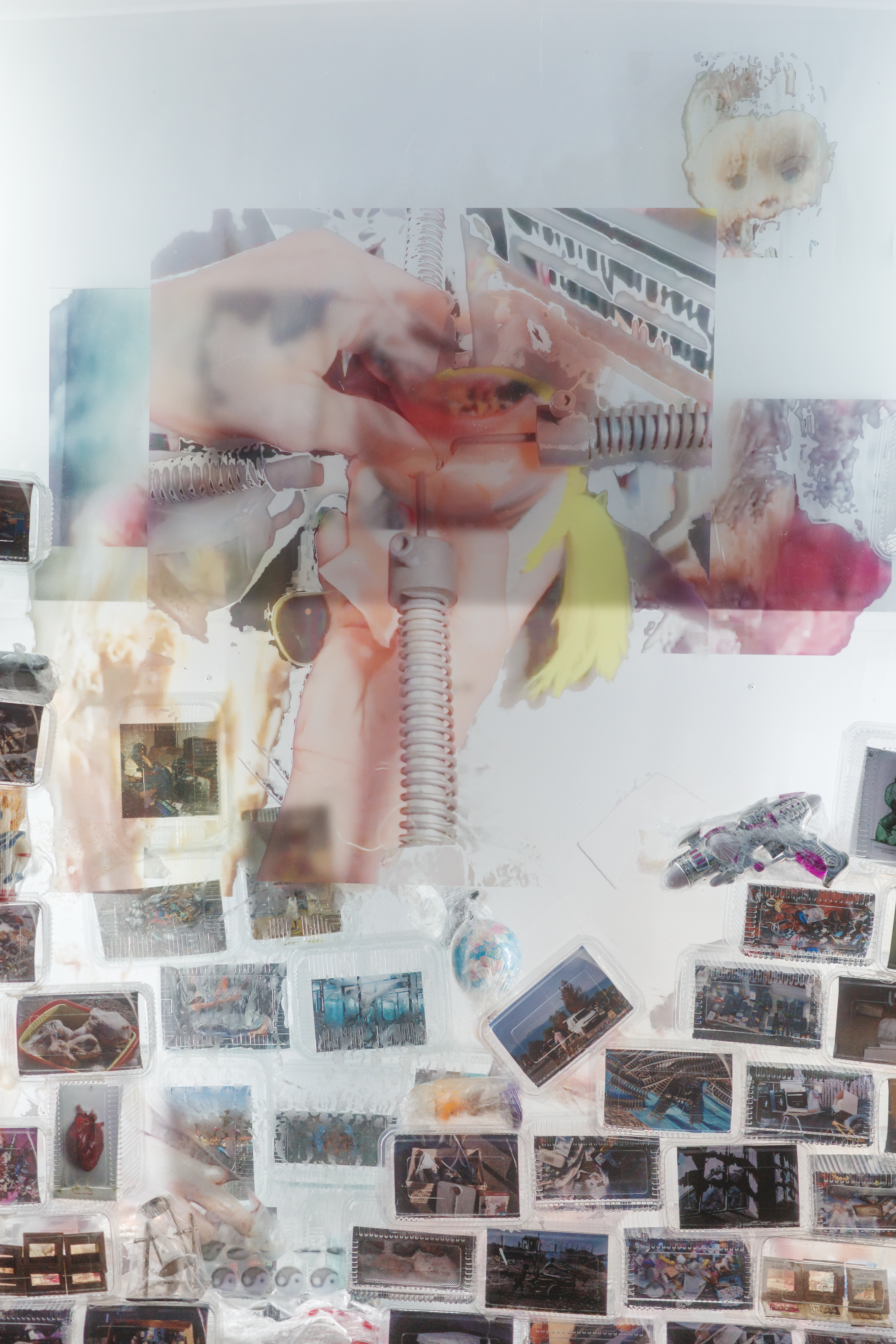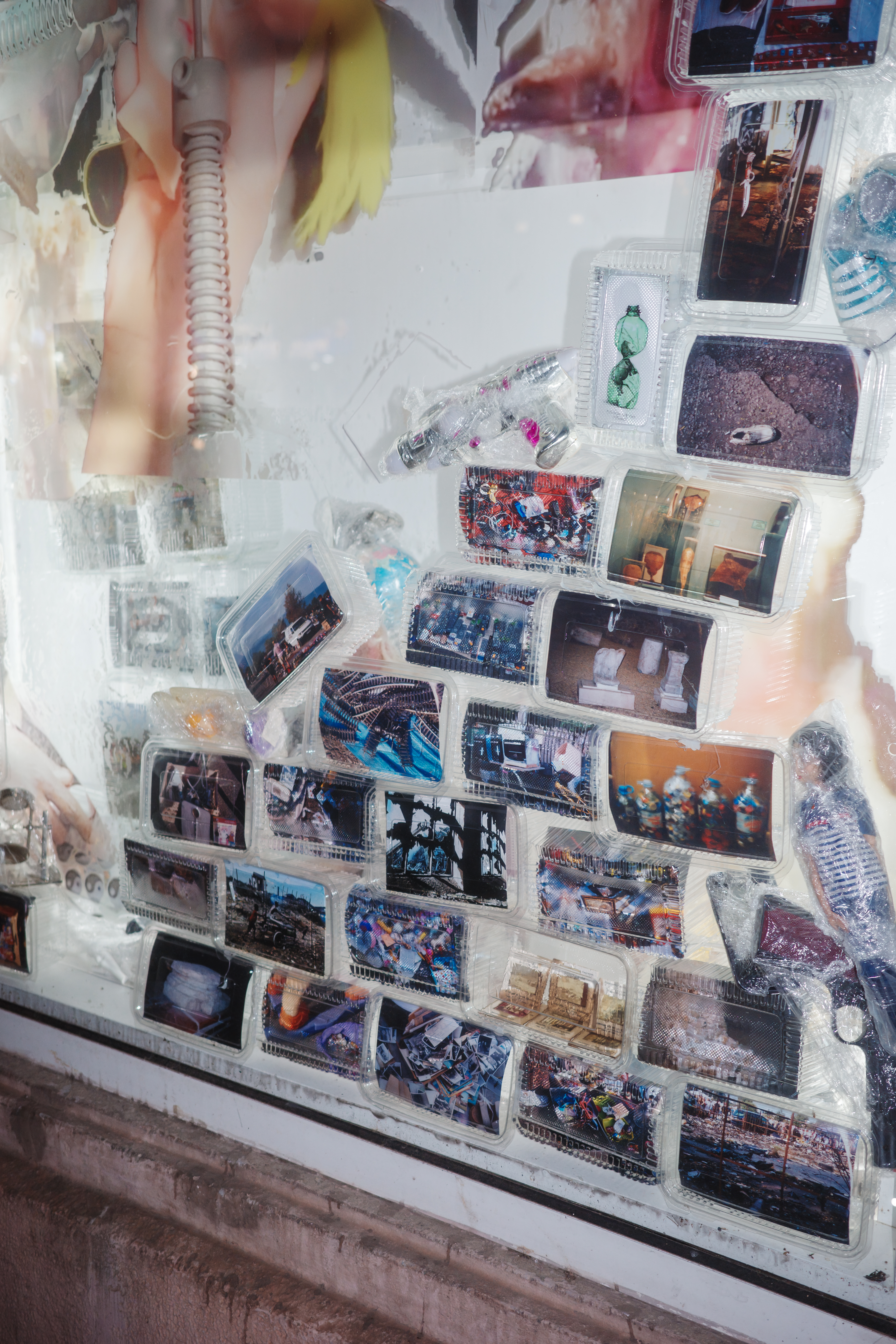 The installation overlays found objects mummified and wrapped in plastic, digitally eroded archival images, ephemeral iPhone snapshots and submerged 35mm film photos. Playing with transparency and opacity through additional lenses, narratives are created through parallel contexts. Repository of Future Ruins raises a paradox between preservation and decay, considering alternate methods of archiving, questioning visual aesthetics and methodologies for archival processes. The installation is about storing and (re)collecting memories, through hints and suggestions, imagery, sculpture and materiality.